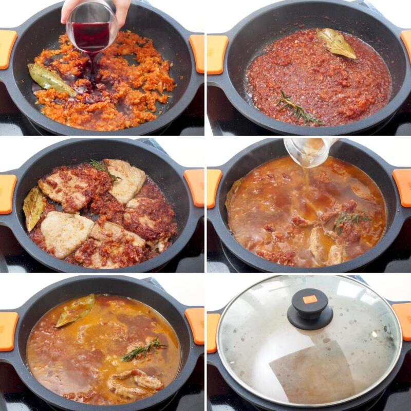2. Incorporación de vino y caldo como parte de la salsa.